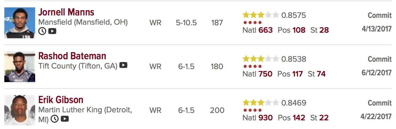 And Fleck, on the other hand? He got a VERY late start on 2017 recruits and was still able to pull in a WR class that was better than all of Kill’s outside of 2016. He had to flip Douglas from CB to WR but that looks like it could work. Douglas showed a nice spark before he also got hurt.