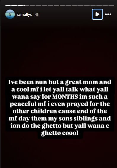 Ive been nun but a great mom and a cool mf i let yall talk what yall wana say for MONTHS im such a peaceful mf i even prayed for the other children cause end of the mf day them my sons siblings and ion do the ghetto but yall wana c ghetto coool
