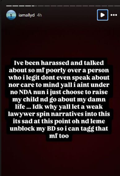 Ive been harassed and talked about so mf poorly over a person who i legit dont even speak about nor care to mind yall i aint under no NDA nun i just choose to raise my child nd go about my damn life⦠Idk why yall let a weak lawywer spin narratives into this its sad at this point oh nd leme unblock my BD so i can tagg that mf too