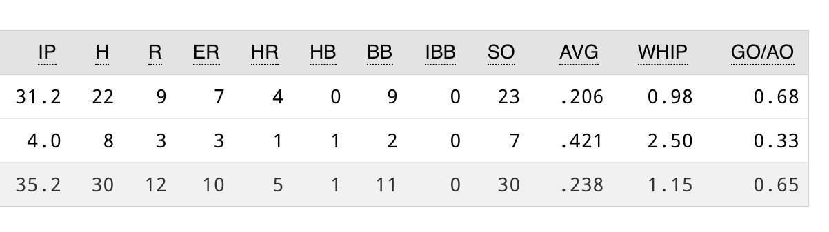 Next five starts: 15 strikeouts, 31 ground balls, 49 fly balls, 5 HRStrikeouts are way down, but it’s also surprising to see so many well-struck fly balls vs. a high-velocity ground-ball guy.