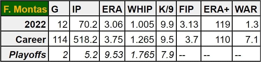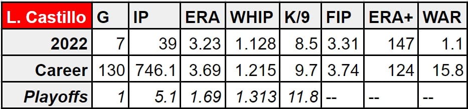 Castillo has the 3rd most innings pitched on this list and he has the second-most career WAR (15.8). His 147 ERA+ is the best of the bunch. His stuff is probably the nastiest, too. Playoff experience? Much like Montas, there isn’t much. But in his only appearance, Luis Castillo threw a 5.1 inning gem.