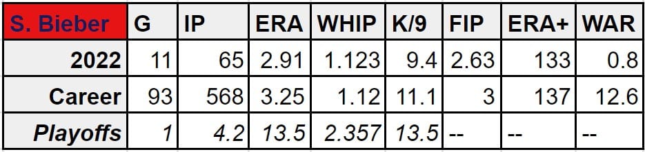 Bieber has the lowest ERA this season, of any pitcher listed. He also has the best career K/9 rate, FIP, WHIP and ERA+ of any other pitcher listed. As far as availability, he pitches for the Cleveland Guardians and he’s going to be a free agent in 2025.