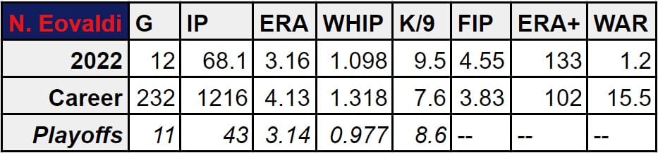 But there’s no argument he belongs and would be a great pick up for Minnesota Twins team with playoff dreams. Of the five pitchers above, Nick Eovaldi’s 11 games of playoff experience are the most by far. It’s not just the experience, though. It’s what he’s done with it (3.14 ERA, 0.977 WHIP). If you’re trading for one of the five pitchers on this list, with ONLY the 2022 playoffs in mind, an argument could absolutely be made that Eovaldi is your best option.