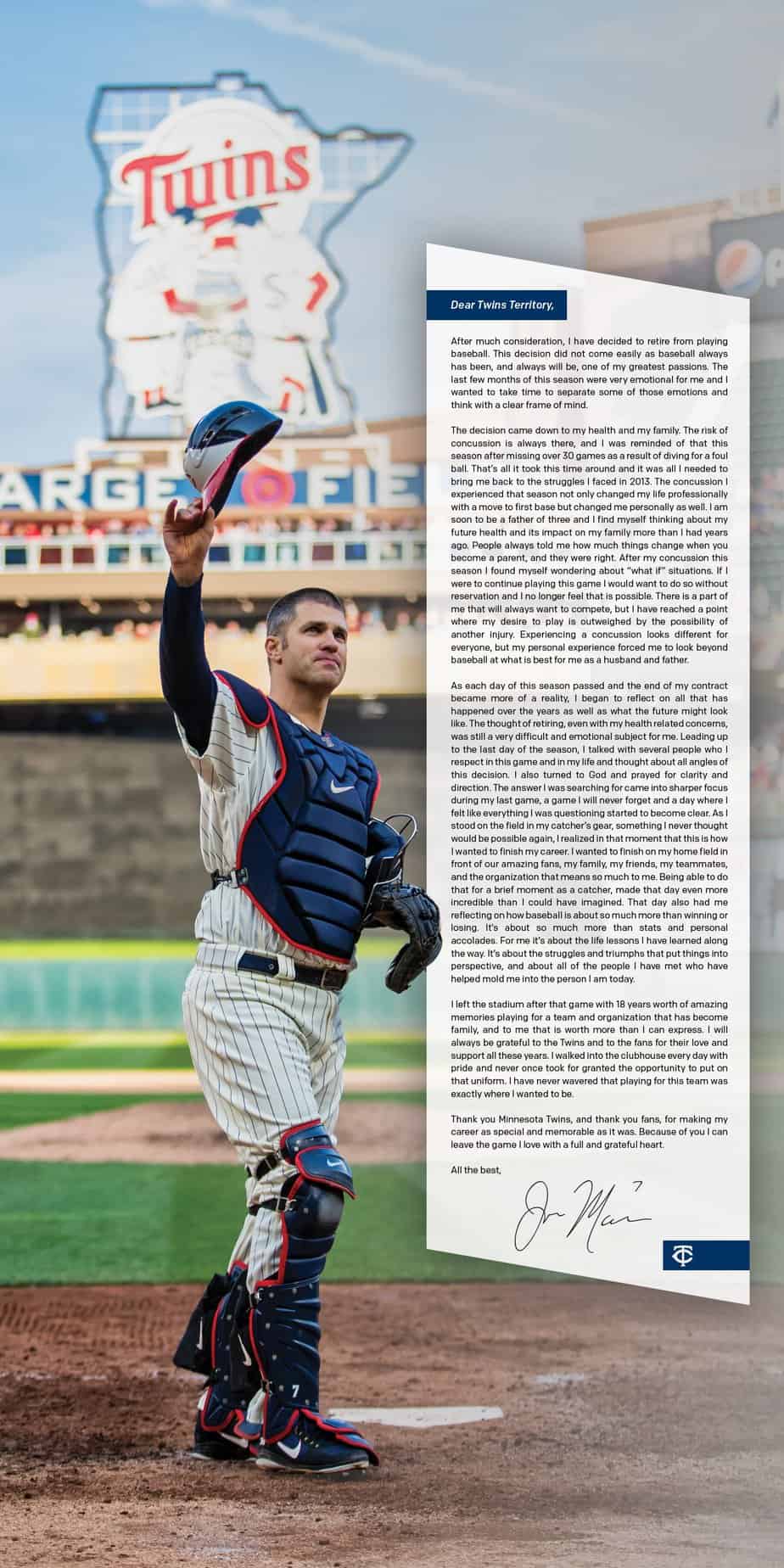 “Thank you, Minnesota Twins, and thank you, fans, for making my career as special and memorable as it was. Because of you I can leave the game I love with a full and grateful heart.”