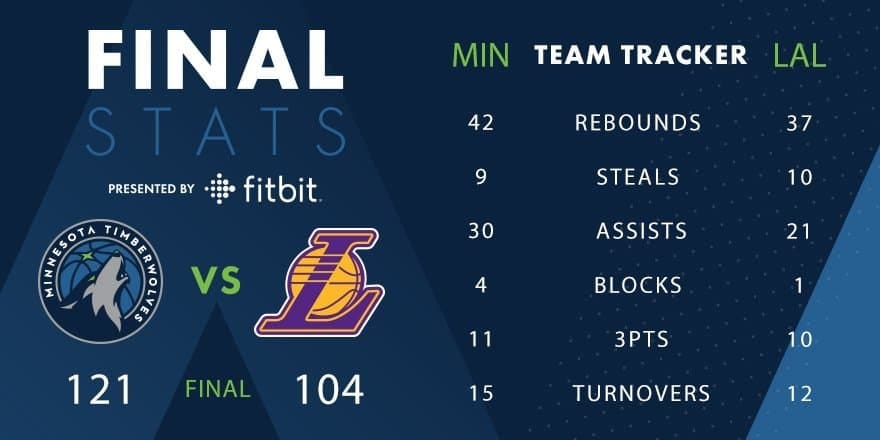 Timberwolves beat Lakers 121-104 for first Christmas win https://t.co/m4f3TzE0qQ #Timberwolves https://t.co/d6ClNbQlMW pic.twitter.com/w5yzLjjFaI
