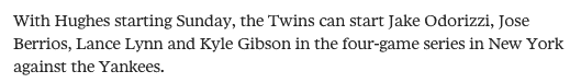 Minnesota’s next (scheduled) off day isn’t until May 17th. With their best pitcher from 2017, Ervin Santana, expected to return around that time, how long Hughes stays among the reigning A.L. Manager of the Year’s Top 5 starters will remain to be seen.