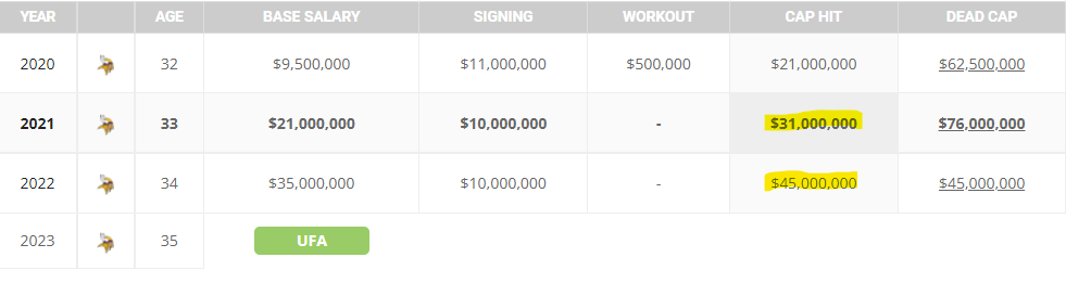 As his contract stands right now, Kirk’s cap hit is set to increase from $31 million in 2021 to $45 million in 2022 (his last season). That’ll move Cousins from “worth it” to “holy shit”. Spending $45 million of your cap on one player, no matter how important, is a difficult pill to swallow.