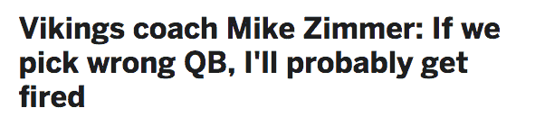 Who Minnesota has under center, to begin next season, could end up defining Rick Spielman’s career. No pressure, my man. Naturally, the trickle-down effect of what the Purple’s GM decides, will largely impact our head football coach, Mike Zimmer.