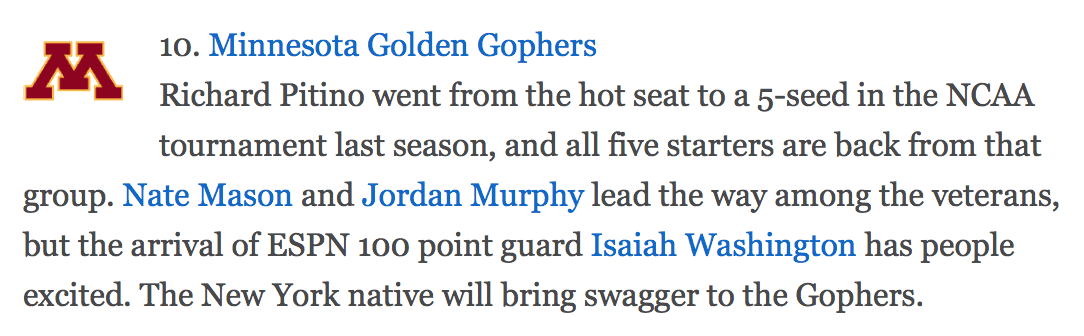 We’ve talked about his already but there is a lot of hype surrounding Gopher Basketball as we enter into the 2017-2018 season. After the most B1G wins since the ’89-’90 season, last year, Pitino and his basketball team have caught the attention of national basketball talking heads. First, here is what ESPN had to say about the Gophers.