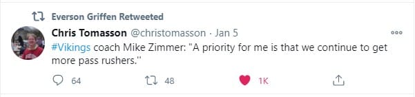The next day was full of more ‘Everson Griffen come back to Minnesota’ retweets, including one by Chris Tomasson that I found interesting. And then later that same day… Ev tweeted for himself again.