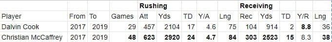 Cook will never produce the all-purpose yards McCaffrey does. He isn’t on the field enough. While Christian plays a whopping 93% of offensive snaps for the Panthers, Dalvin only plays 59% (Lineups.com). There are good reasons why the Vikings aren’t going to pay Cook the same way Carolina paid McCaffrey.