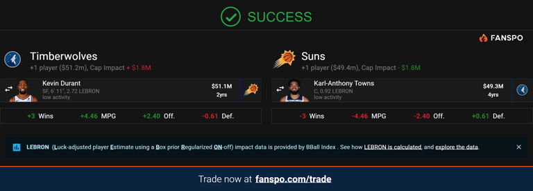 The Suns can’t trade Durant to Team X and receive two players back, to help get equal salaries going in and out. But KAT and KD cost nearly the same amount next season, making the swap easy for the NBA trade machine. Straight up, the trade goes through swimmingly.